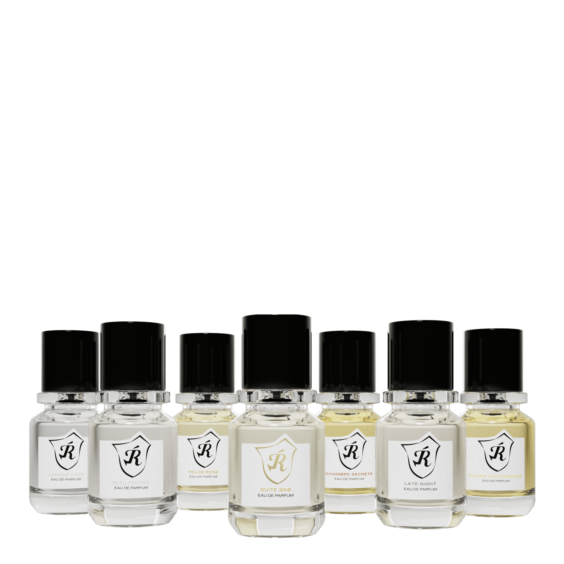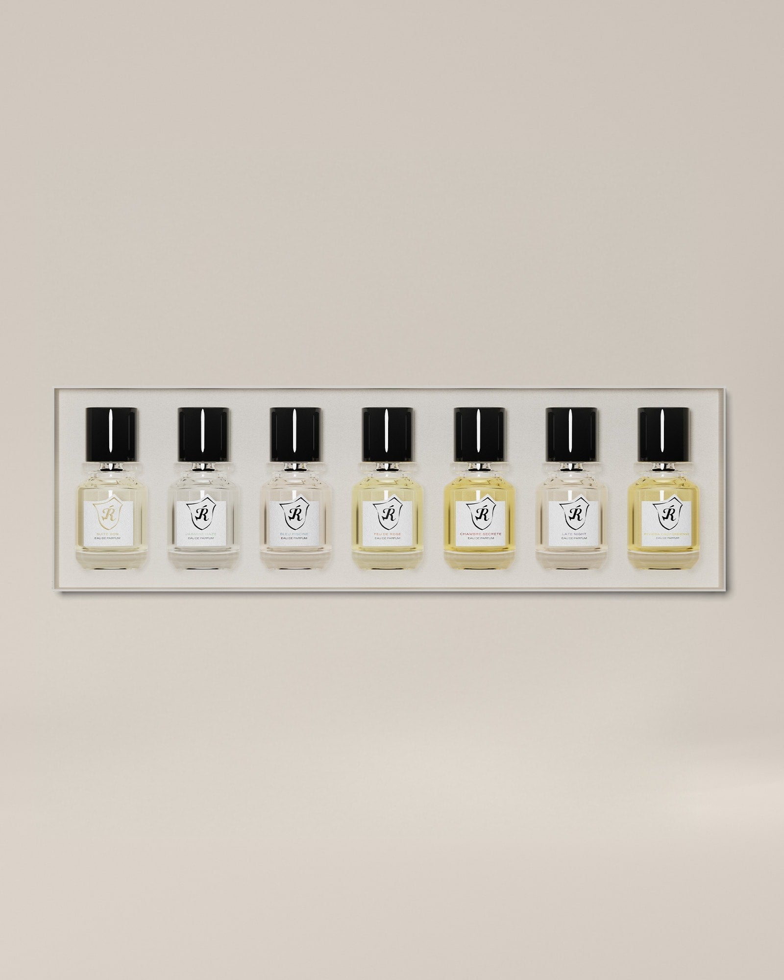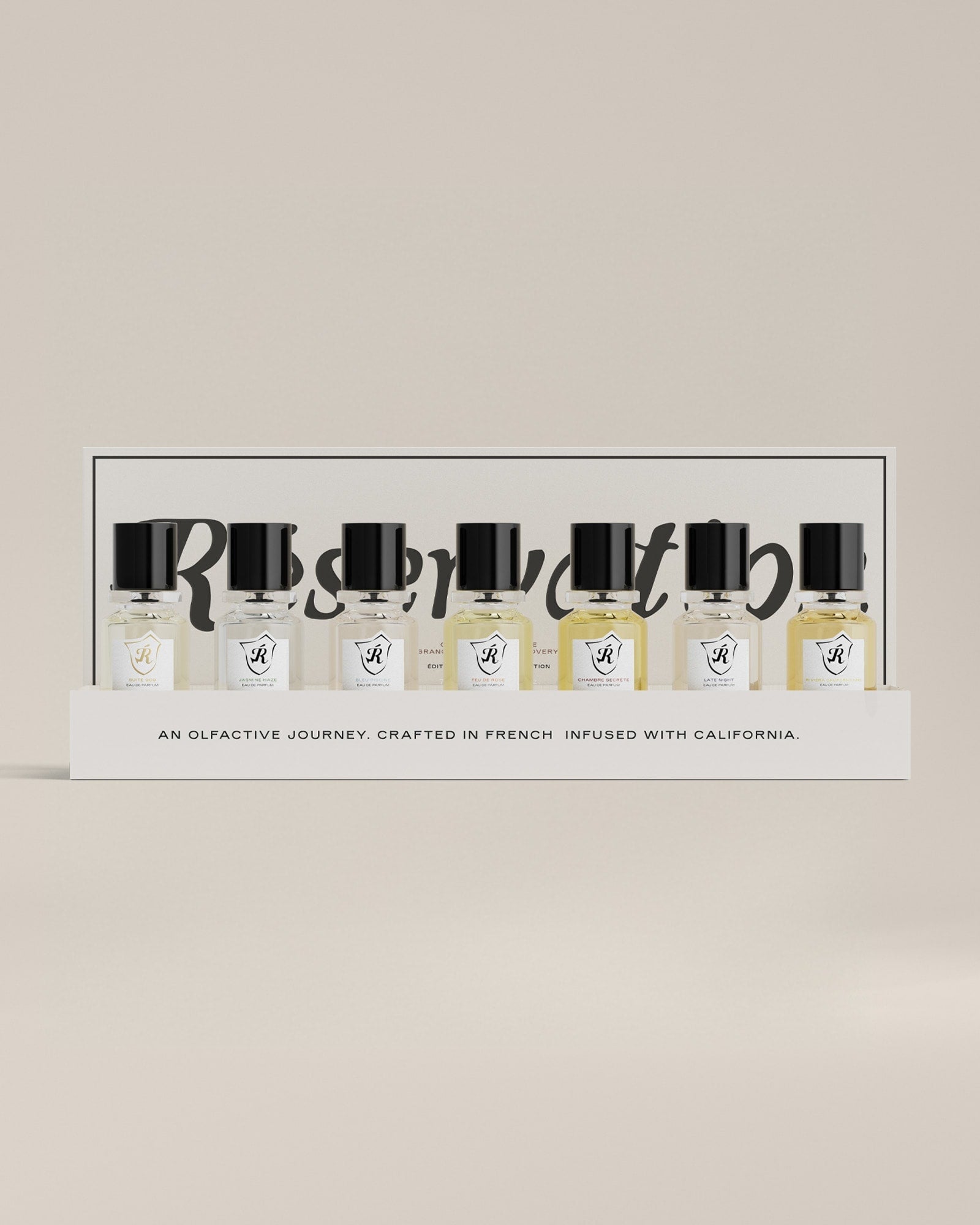 Explore our complete collection, designed to awaken an imaginary world of legendary hotel adventures. Includes seven 15ml eau de parfum of Suite 909, Jasmine Haze, Bleu Piscine, Feu de Rose, Chambre Secrète, Late Night and Riviera Californienne. Each fragrance captures a moment or memory from our imagined world of a legendary hotel.